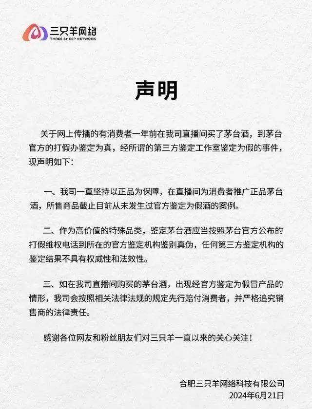 面临质疑,三只羊收集发布声明,否定其曲播间所售商品被判定为假酒,并强调任何第三方判定成果不具备权势巨子性取法令效力?。