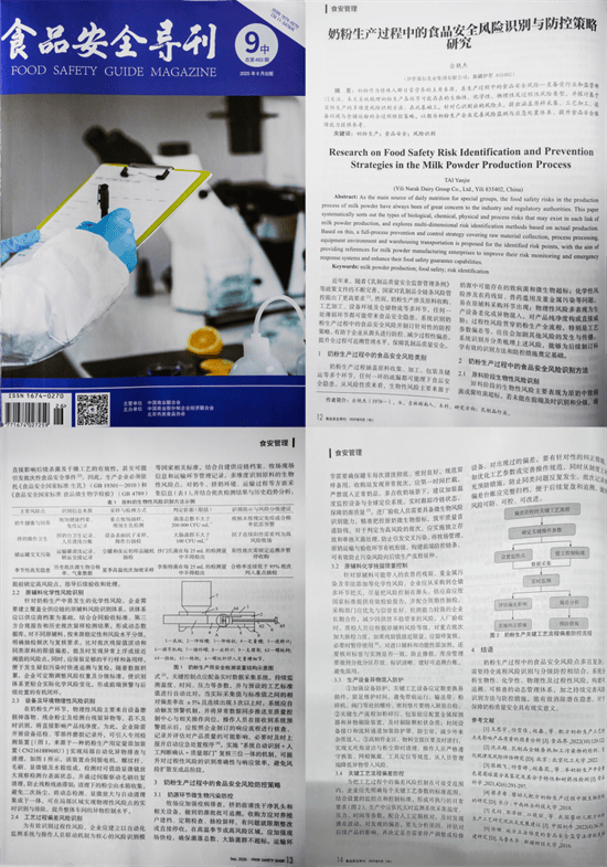 近日,伊犁那拉乳业集团无限公司董事长台艳杰的学术论文《奶粉出产过程中的食物平安风险识别取防控策略研究》正在《食物平安导刊》2025年9月(中)第19卷正式颁发。